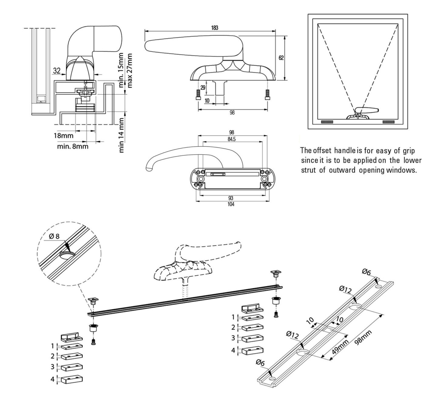 The employ of Die-cast aluminum handle and zamak case. its differs from the basic casement bolt because, apart from having only one transmission fin, it has an offset handle for ease of grip since it is to be applied on the lower strut of outward opining windows.