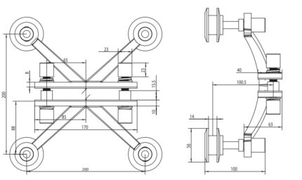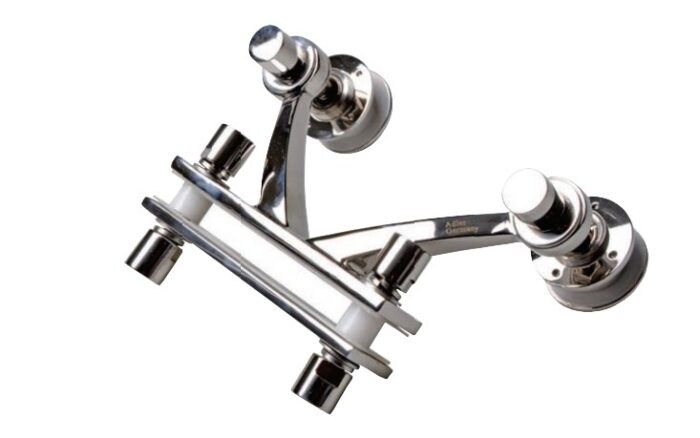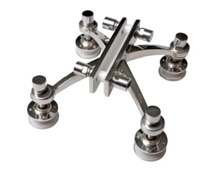 Four arms spider fitting used to attach four inline glass panels to structural center fin