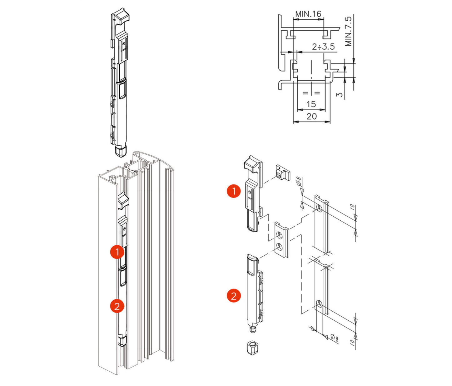 Technical features Simple and quick to apply by simply making a hole diam. 8mm on the rod. Permits making one or more supplementary fastenings on any frame. Offers the possibility of adjusting the force of the closing pull